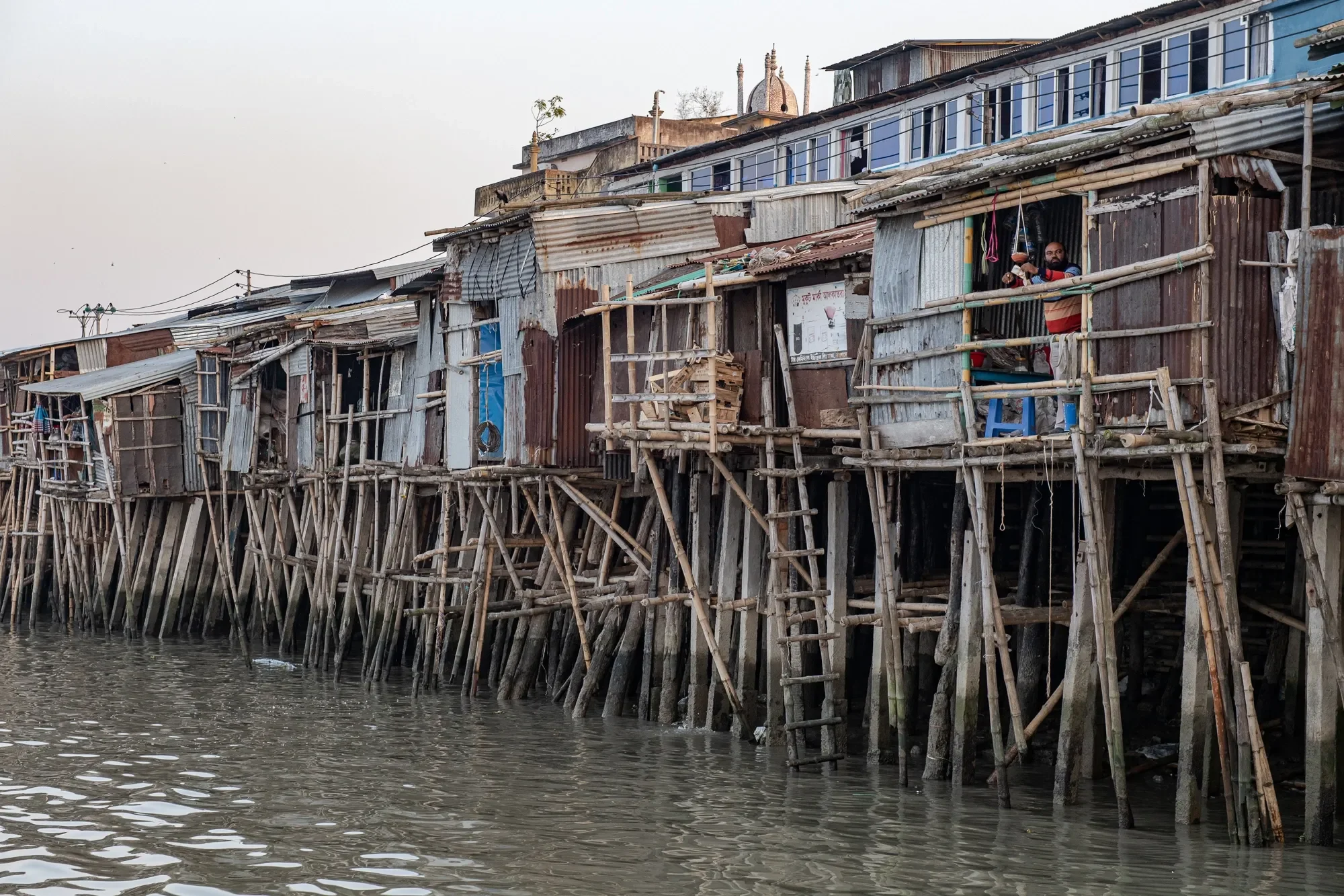 KHULNA, BANGLADESHMarch 2019 The rear of shops on the Boro Bazar, overlooking the Rupsha River in Khulna, Bangladesh. Rapid urbanization, sediment obstruction and waste disposal have severely polluted the river. Photo: Cynthia van Elk │ Water as Leverage